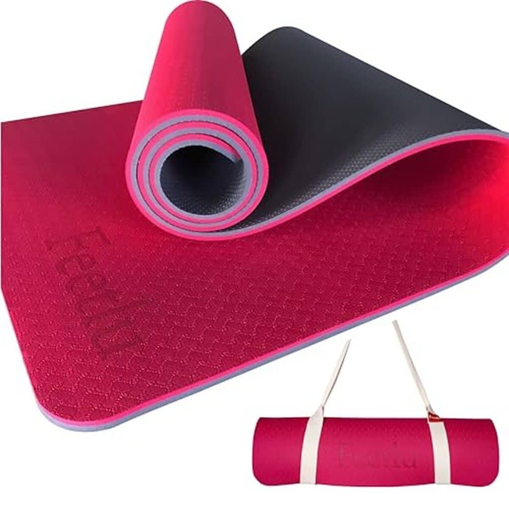 Tapis de yoga épais avec sangle, conçu pour offrir confort et stabilité. Idéal pour les amateurs de yoga, pilates et exercices au sol, ce tapis double face promet une expérience d’entraînement rehaussée.